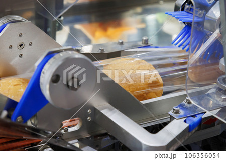 baked bread in food grade plastic bag on conveyor belt moves to seal in packing machine at production line of bakery manufacturing factory. food processing and industry concept.