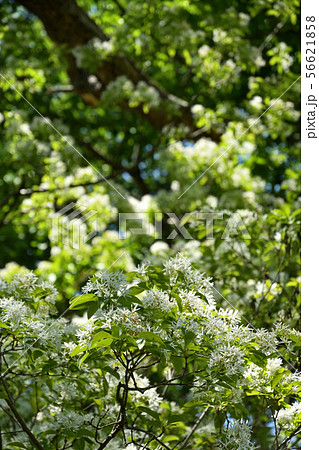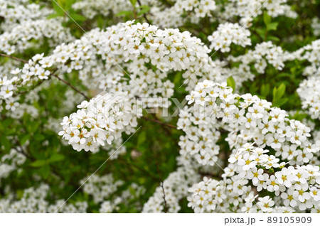 雪柳的白色小花在春日的陽光下閃閃發光。