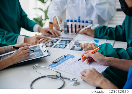 Multiracial medical team having a meeting with doctors in white lab coats and surgical scrubs seated at a table discussing a patients records