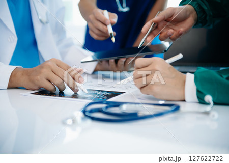 Medical team having a meeting with doctors in white lab coats and surgical scrubs seated at a table discussing a patients working online using computers in the medical