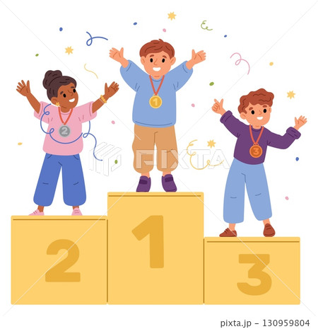 Little boys and girl stand on podium with medals. Children celebrate victory in competition or contest. Winners pedestal and confetti. Award ceremony. Kids achievements. Vector concept