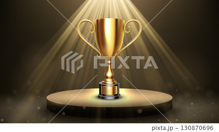 Shiny Golden Trophy on Luxury Podium Illuminated By Spotlights, Victory Celebration, Vector Illustration