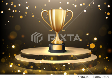 Shiny Golden Trophy on Luxury Podium with Flying Particles, Victory Celebration, Vector Illustration