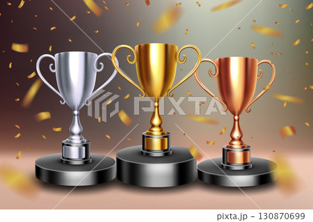 Championship with 3 Trophies on Podium with Gold Confetti Falls, Victory Celebration, Vector Illustration