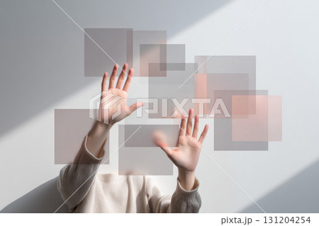 Hands reaching towards floating transparent squares modern minimal style soft natural light creative technology concept abstract composition Asian person innovation curiosity