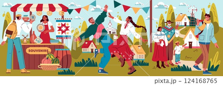 Slow travel illustration. A lively outdoor market scene featuring interactions among travelers and locals, showcasing regional crafts, dancing, and community bonds. Experience culture and joy. Vector