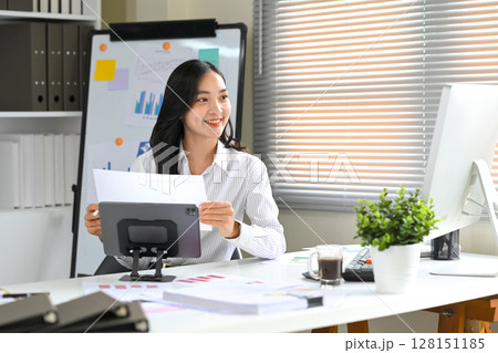 Beautiful young businesswoman with a headset talking in video conference on computer monitor