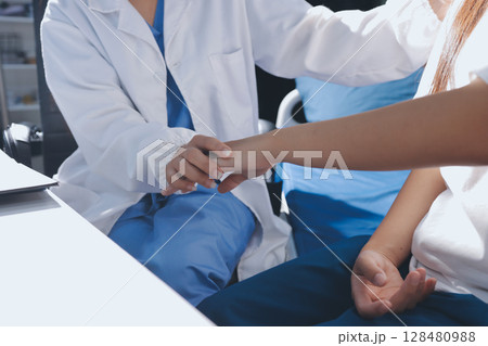Asian female hands touching old female hand Helping hands take care of the elderly concept in hospital.