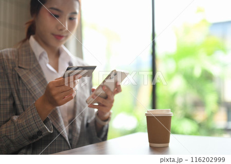 Young businesswoman holding a credit card making online payment on mobile phone, sitting at workplace table