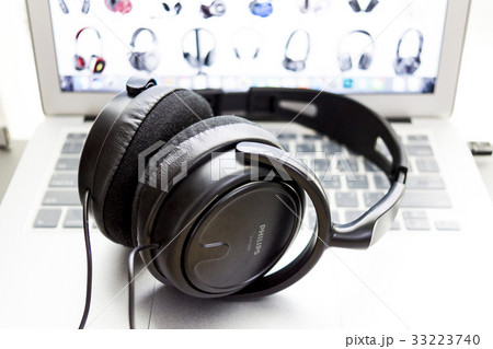 耳罩 耳機 黑色 音樂 電線 桌 電腦 螢幕 白色 灰色
