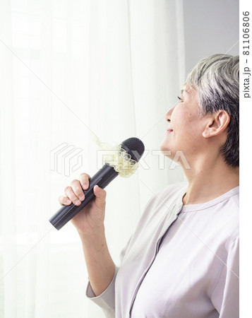 快樂的亞洲成熟女人用麥克風唱歌.