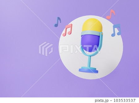 復古麥克風漂浮在紫色背景上,音樂工作室卡拉OK概念。 簡約的卡通可愛光滑