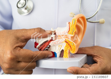Asian doctor holding human ear model to learn and treat hearing loss in patient.