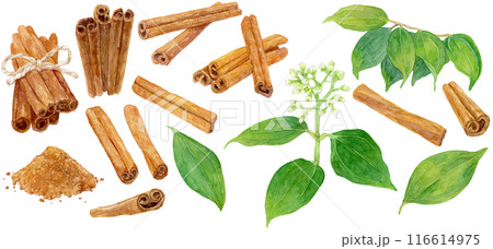 肉桂棒、葉子、花朵水彩插畫素材合集