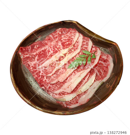 手繪, 生板腱,牛肉片, 有花紋的盤子, 白色背景,可去背