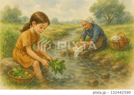 溪邊洗菜與洗衣的祖孫情水彩插畫