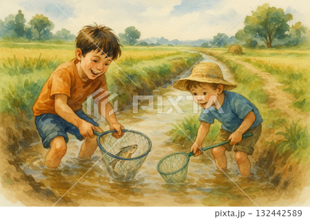 鄉間小溪抓魚玩耍的童年回憶插畫