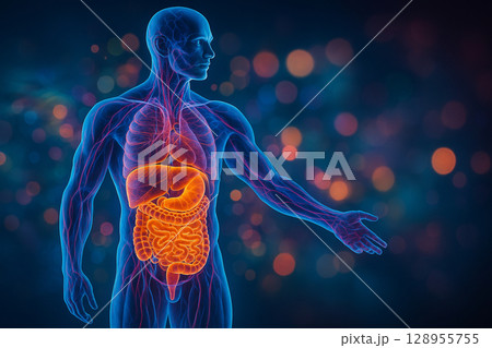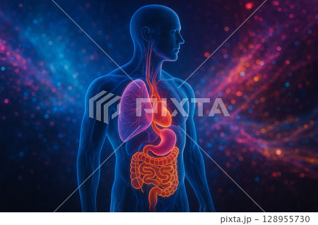 AI generated ultra detailed sci fi artwork showing glowing internal organs including lungs and intestines in a semi transparent human body on abstract background