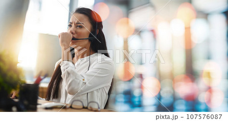 Callcenter agent, woman with cough and sick, health fail and lungs with banner, bokeh with virus or bacteria. Respiratory, pneumonia or tuberculosis with customer service consultant and healthcare