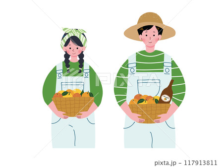 拿著一籃子蔬菜的男性和女性農民的插圖