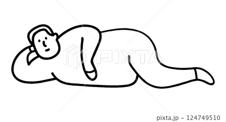 簡單的黑色手繪線描插圖,描繪了一個胖子以邋遢的姿勢躺著,在透明的背景上被剪下來