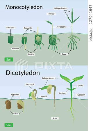 illustration of biology, Growth of monocotyledon and dicotyledonous plants, patterns of change in seed, Monocots and dicots vector illustration, Labeled comparison division scheme