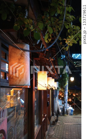 一條街道兩旁是傳統的韓式房屋,燈光溫暖明亮。