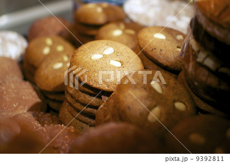 German Lebkuchen, Christmas cookies, in wooden bowl. Traditional spice cookies, similar to gingerbread, circle shaped, sugar glazed, with candied fruit pieces, dipped in dark chocolate at the bottom.