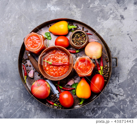 Red mojo rojo and green mojo verde sauces, traditional Tenerife dips, mojo picon dressing