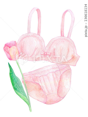 Pink purple lingerie, lace socks, women pyjamas. Watercolor illustration isolated on white. Logo, leaflets, booklets, postcards, packaging in underwear stores. Composition arrangement with lingerie