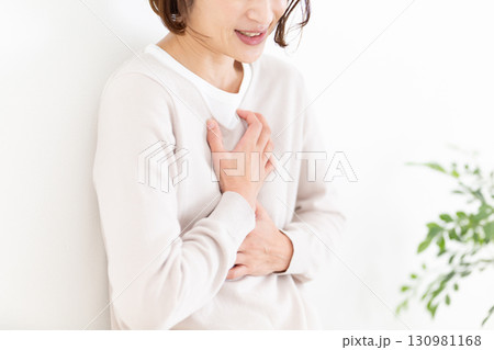 一位中年婦女在白色背景下感到心悸,沒有臉