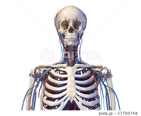 Human torso anatomy. Skeleton with veins and arteries. Front view