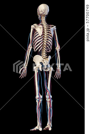 Human body anatomy. Skeleton with veins and arteries. Back perspective view.