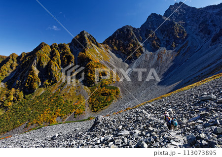 登山者沿著北阿爾卑斯山的唐澤彎道、紅葉和前穗高岳北脊前進