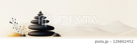 Balanced Zen Pebble Stack on Minimalist Landscape with Mountain Background
