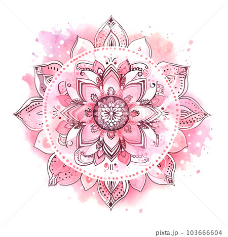 Doodle style black and pink line art lotus with yoga chakras pictogram, hieroglyph.
