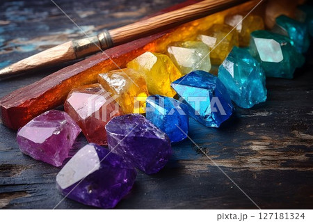 Rainbow Array of Rough-Cut Crystals with Wooden Rod on Dark Wood