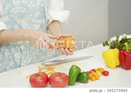 中年婦女在廚房裡用削皮器削胡蘿蔔