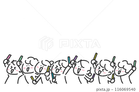 人們在音樂會上熱情興奮,筆燈,男女,年輕人,歡呼,上半身,簡單的線條畫插圖