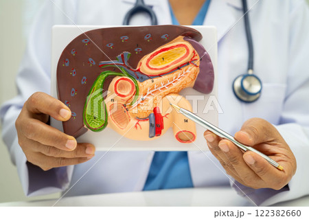 Liver with gallbladder, pancreas spleen and duodenum, Asian doctor holding human anatomy model for study diagnosis and treatment in hospital.