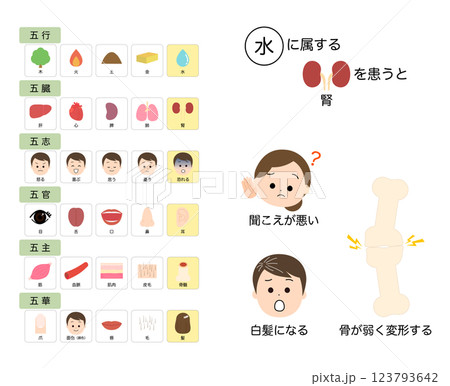顯示肝、心、脾、肺和腎功能的插圖,這是東方醫學的五個器官。
