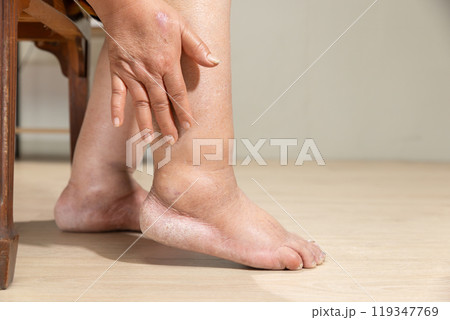 Gout treatment. Arthritis joint in the ankle. Doctor diagnoses swollen and inflamed foot joint. Physician looking at x-ray scan. Human feet bone with uric acid crystals. Medical appointment and exam