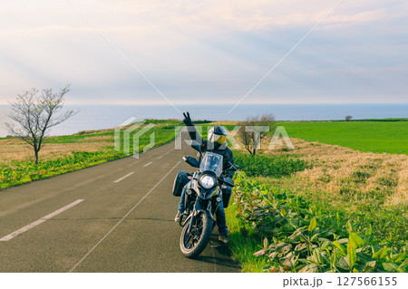 騎士和摩托車手在北海道能取岬做出和平手勢