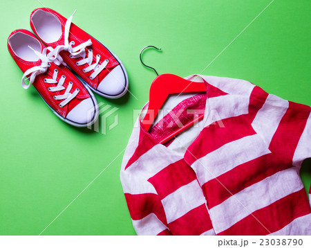 Red Sneakers shoes, grass, ladybug. Gumshoes.