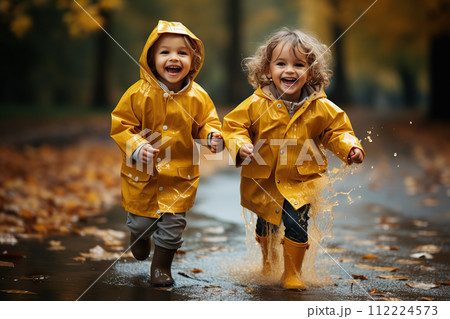 Joyous Autumn Splash Playful Children in Yellow Raincoats Dancing Through Puddles on a Rainy Day Stroll. created with Generative AI