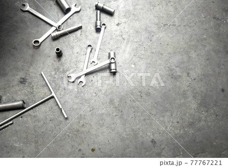 SELANGOR, MALAYSIA -APRIL 16, 2017: Car workshop tools left lying around on the floor. Workshop floor greasy and dirty.
