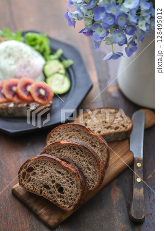 亞洲年輕男子在家看報紙時吃早餐/麵包