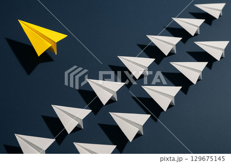 A yellow airplane directing multiple white airplanes on a black background symbolizing bold leadership decisions
