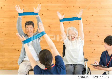 老年婦女和物理治療師訓練手臂管(康復/鍛煉)