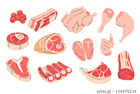 Meat set. Collection of beef and pork steak, ham, fillet. Fresh ingredient for cooking. Chicken and sausage. Isolated vector illustration in cartoon style